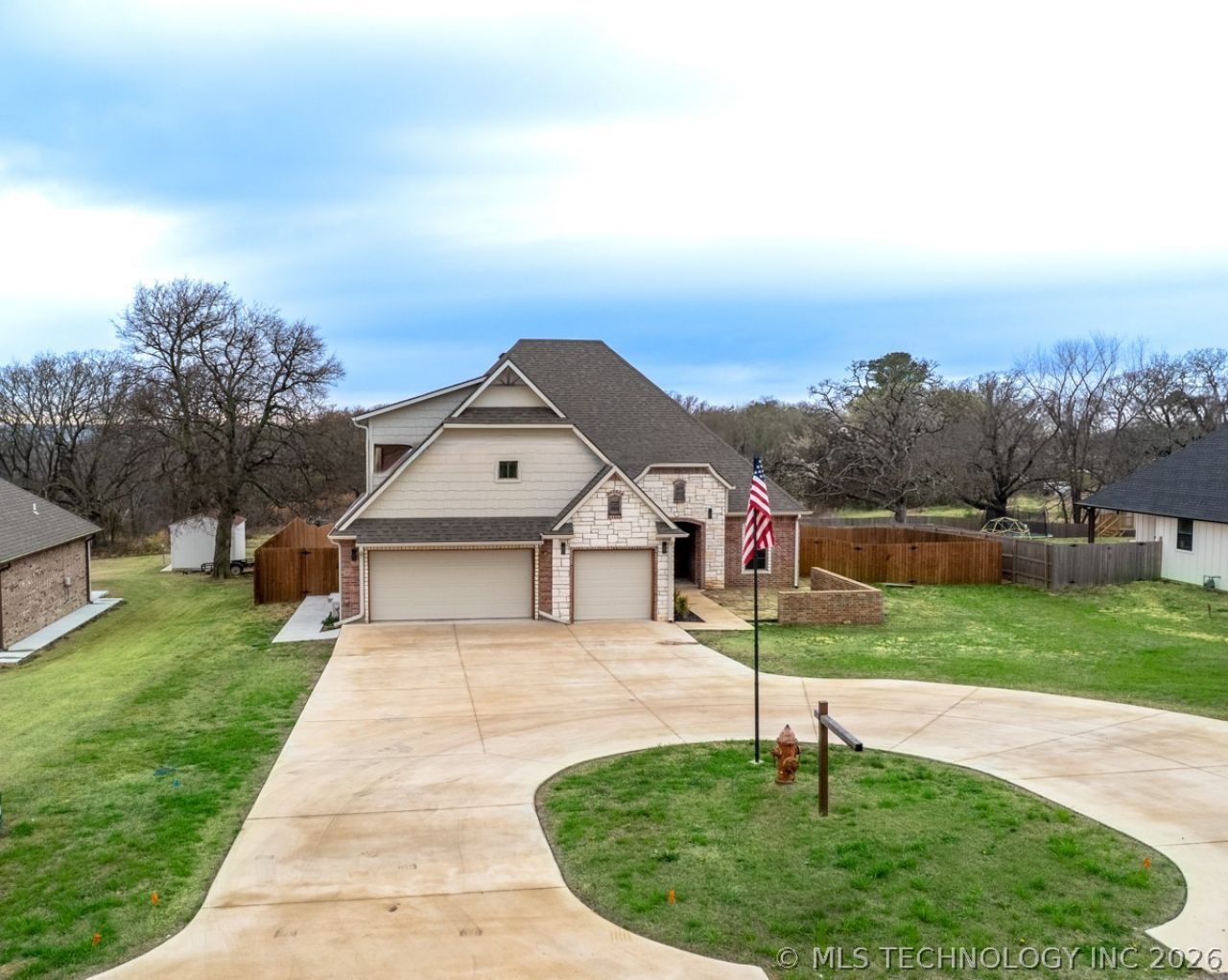 Quality, comfort & elegance are a few words to describe this well built, newer brick home. The appealing concrete circle driveway and furrowing flag pole invite you in to the residence with ample parking by the overhead doors of the 3 car garage. It continues to draw you to the front flagstone courtyard area along the sidewalk and into the arched entryway leading to the French front doors. Once inside you are greeted with solid hardwood flooring and the cozy sitting room, or office off of the living room which boasts vaulted ceilings, ceiling fan, elegant electric fireplace, & 75" Vizio smart TV mounted above the mantle of a stylish diagonal chimney face finish. Its open floor plan provides the space for the adjoining kitchen which sports a long gorgeous granite counter top bar, custom cabinets, pantry & other ample storage space. Also comes with newer Frigidaire range/ oven, built in microwave, refrigerator, & dishwasher. The double bay stainless sink comes equipped with Delta faucet & garbage disposal. The spacious laundry room has a long granite folding counter, custom cabinetry, closet, and deep bay sink. Down the hallway awaits the large primary suite with trayed ceiling which leads into the primary bathroom that features a lighted vanity, double sinks, & roomy walk in tiled shower. Attached is a large walk in closet that has built in shelving and clothes racks. The split bedroom configuration offers a nice bathroom sitting between the other 2 bedrooms. The upstairs bonus room is sure to be a hit for a reading, movie, or gaming area and also has a room for storage and whatnots. The property also features a big backyard surrounded in privacy fence with a covered concrete porch and flagstone path for an evening fire, or daytime sunning spot.