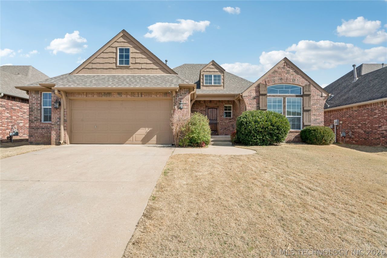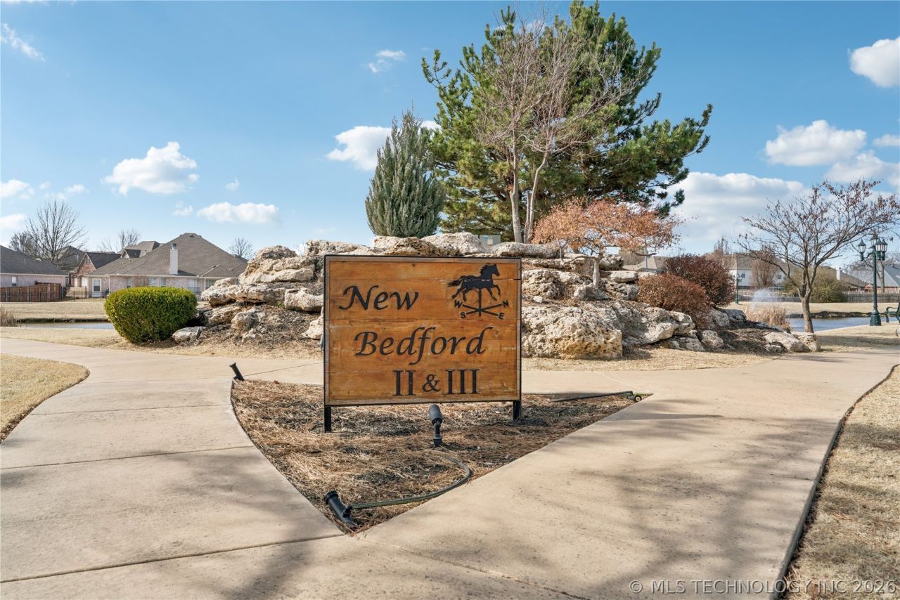 Welcome home to this move-in ready 3-bedroom, 2-bath property featuring a functional single-level split floor plan with 9+ ceilings and a spacious living area with gas fireplace that flows seamlessly into the open kitchen. The kitchen offers granite countertops, island, pantry, and breakfast nook, while a formal dining room provides flexibility for an office or additional living space. The private primary suite includes vaulted ceilings, a large walk-in closet with additional seasonal hanging space, and a full bath with double sinks, soaking tub, and separate shower. Secondary bedrooms are positioned on the opposite side of the home for privacy. Recent improvements include a new roof in 2023 along with updated flooring, interior and exterior paint, lighting, and additional upgrades that enhance both style and function. Located in New Bedford II directly across from the neighborhood pond and fountain, the home offers access to neighborhood pool and park amenities. Exterior features include a covered patio, full privacy fencing, gutters, and a 2-car attached garage with work area. Conveniently located near Broken Arrow schools, shopping, and major highways.