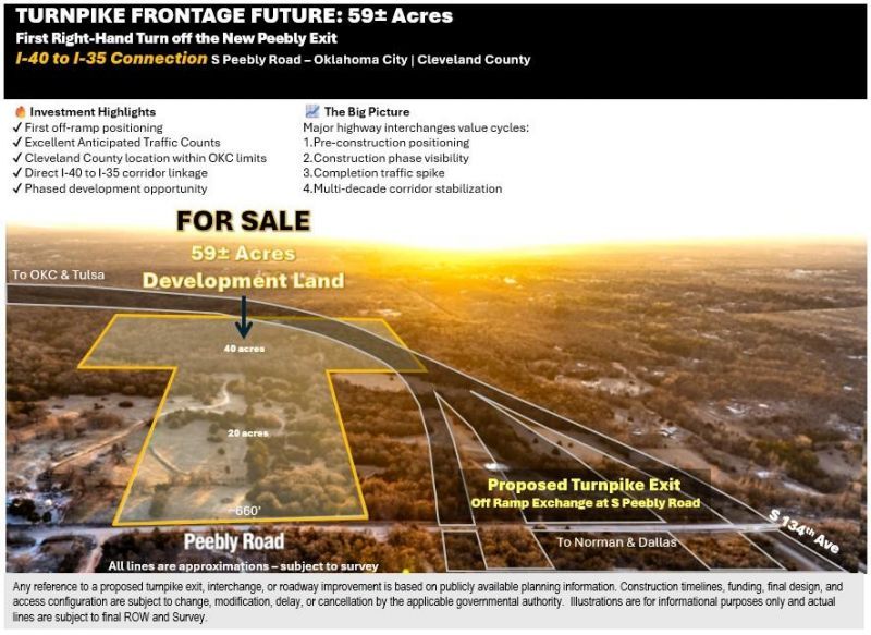TURNPIKE FRONTAGE FUTURE: 59 gross acres - South Peebly planned as the first exit south of I-40 Interchange in OKC off the new 'Outer Loop' (East West Connector) - Future Development Raw Land. Positioned to become the first right-hand turn off the new S Peebly Road exit, this 59; acre tract offers rare control of prime frontage at the intersection of long-term infrastructure expansion & 50-year growth projections. Located in the Newalla area within Oklahoma City limits in Cleveland County, the site sits along the new corridor connecting Interstate 40 (Tulsa & OKC) to Interstate 35 (OKC & Dallas). Few properties offer this level of future visibility & access. Positioned as the first property off the new interchange along Interstate 335 connecting I-40 & I-35, this 59 acres in 2 tracts provides an early-mover advantage in the growth corridor between OKC & Norman. Comprised of two raw land tracts totaling ~59 acres, the property features over 660 feet of frontage on S Peebly Road, providing outstanding visibility, access flexibility, & development versatility. Strategically located between Norman & Shawnee, the owner will divide upon accepted offer & entitlement, & private utilities are permitted. Early positioning along major transportation projects consistently drives long-term value. Secure frontage, scale, & future access in one of the metro's most promising corridors. ***Please note: References to a proposed turnpike exit, interchange, or roadway improvement are based on public planning info. Construction timelines, funding, final design, & access configuration are subject to change. Illustrations are for informational purposes only & actual lines are subject to final ROW & Survey.